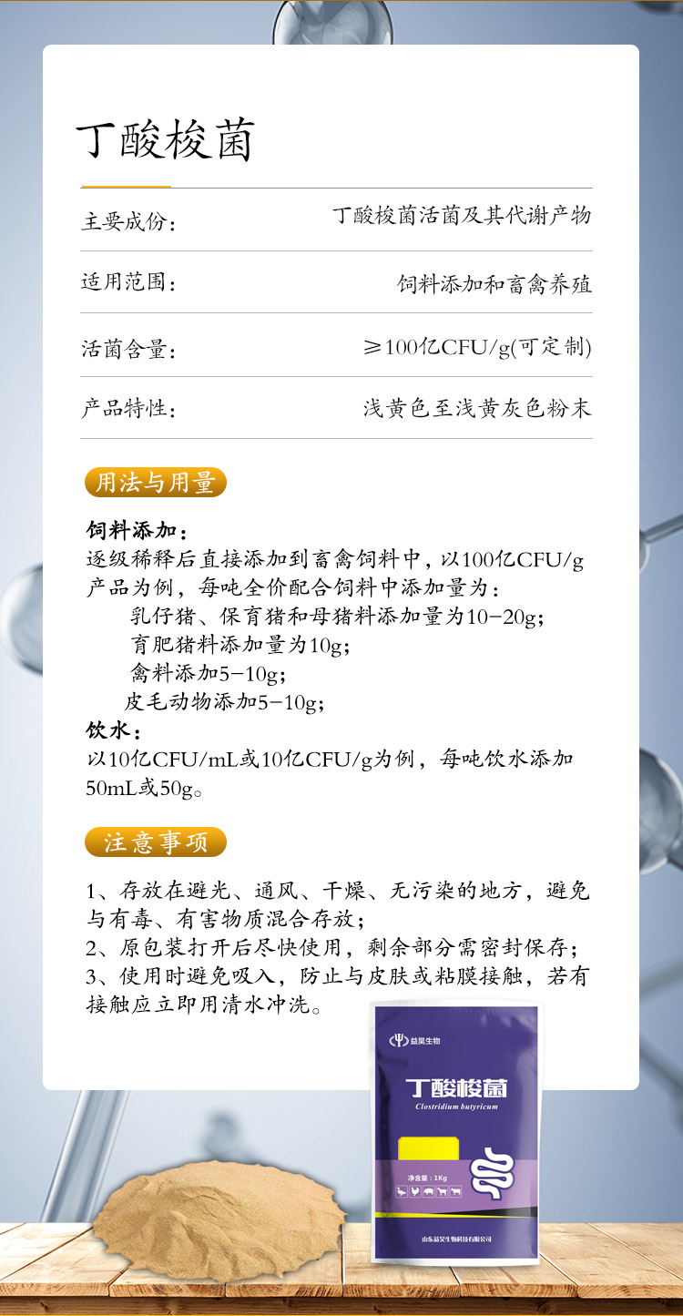 【主要成分】:丁酸梭菌、菌種生長促進劑及功能性載體。
